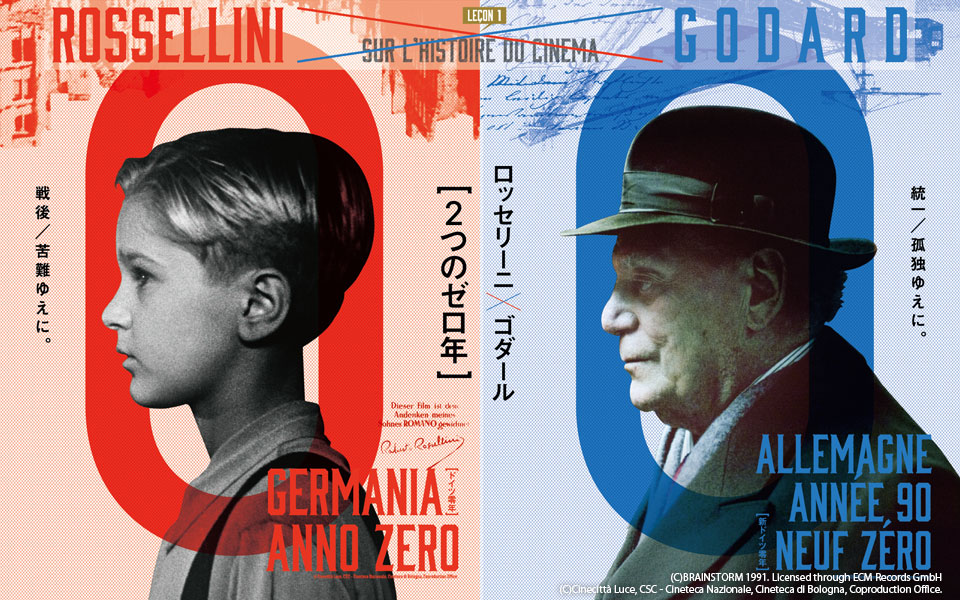 第二次世界大戦後の廃墟と化したベルリンを舞台に、ひとりの少年を通して戦争がもたらす残酷さを描いたロベルト・ロッセリーニの『ドイツ零年』(1948)と、ベルリンの壁崩壊の翌年、東ドイツに潜伏していた老スパイの西側への帰還の旅を描いたジャン=リュック・ゴダールの『新ドイツ零年』(1991)。1945年をドイツにとっての《ゼロ年》と示し、戦後ベルリンの"虚無の廃墟"を冷徹に描いたロッセリーニに対し、ゴダールは東西ドイツが統合された1990年を《新ゼロ年》として、ふたたび"虚無の廃墟"にもどされたドイツを見つめ直した。思いがけない、でも必然にみちた2作品の邂逅が今実現する。